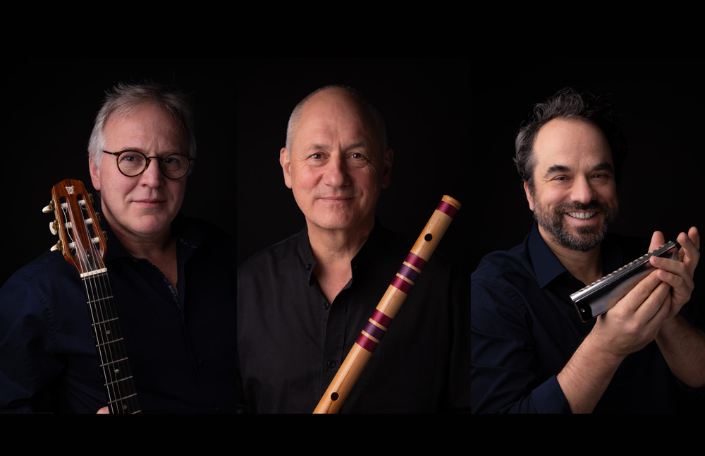 Dieses Trio ist ein faszinierendes musikalisches Phänomen aus dem Schmelztiegel Berlin. Claus Rückbeils ätherischer Sound mit den indischen Bansuri-Flöten trifft auf die betörenden Klänge der Mundharmonika von Marko Jovanovic. Und der Steuermann dahinter ist Lutz Schlosser mit seinem außergewöhnlich stilübergreifenden Gitarrenspiel.